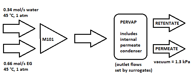 The process is adapted from the literature, utilizing an inlet aqueous glycol feed circulated through a feed tank-membrane-feed tank recycle loop while permeate is continuously extracted by the membrane. To demonstrate the usefulness of the Skeleton model, we will model this system as a Mixer and custom Pervaporation unit per the diagram below and define the flux as an empirical custom mass balance term rather than requiring rigorous diffusion calculations. We will also circumvent the need for a vapor phase and VLE calculations by manually calculating the duty to condense and collect permeate vapor, and use correlations for steady-state fluxes to avoid a recycle requiring tear calculations.