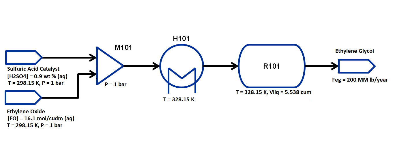 Following the previous example implementing a Continuous Stirred Tank Reactor (CSTR) unit model, we can alter the flowsheet to use a plug flow reactor (PFR). As before, this example is adapted from Fogler, H.S., Elements of Chemical Reaction Engineering 5th ed., 2016, Prentice Hall, p. 157-160 with the following chemical reaction, property packages and flowsheet. Unlike a CSTR which assumes well-mixed liquid behavior, the concentration profiles will vary spatially in one dimension. In actuality, following start-up flow reactor exhibit dynamic behavior as they approach a steady-state equilibrium; we will assume our system has already achieved steady-state behavior. The state variables chosen for the property package are molar flows of each component by phase in each stream, temperature of each stream and pressure of each stream. The components considered are: ethylene oxide, water, sulfuric acid and ethylene glycol and the process occurs in liquid phase only. Therefore, every stream has 4 flow variables, 1 temperature and 1 pressure variable.